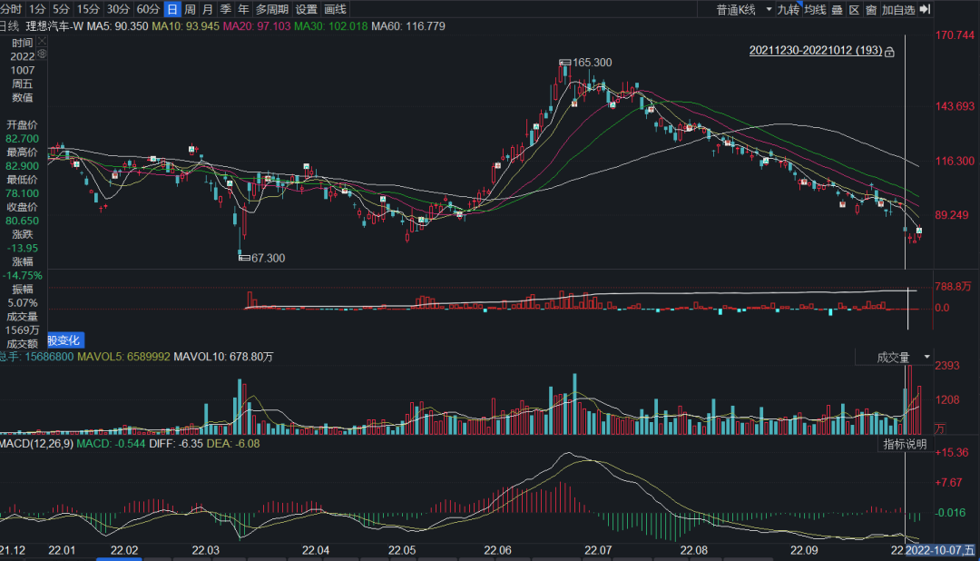 10月7日,理想今年首次一天大跌15%,并且近两个月以来,股价腰斩。