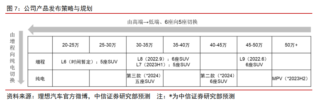 在增程技术路线上,L9(45.98万元)定位于家庭旗舰6座SUV,目前已交付;L8(30万元-40万元)定位于家庭豪华6座SUV,L7(30万元-40万元)是其5座版本,将于11月份交付;未发布的L6(20万元-30万元)成为更低配版本的L7。