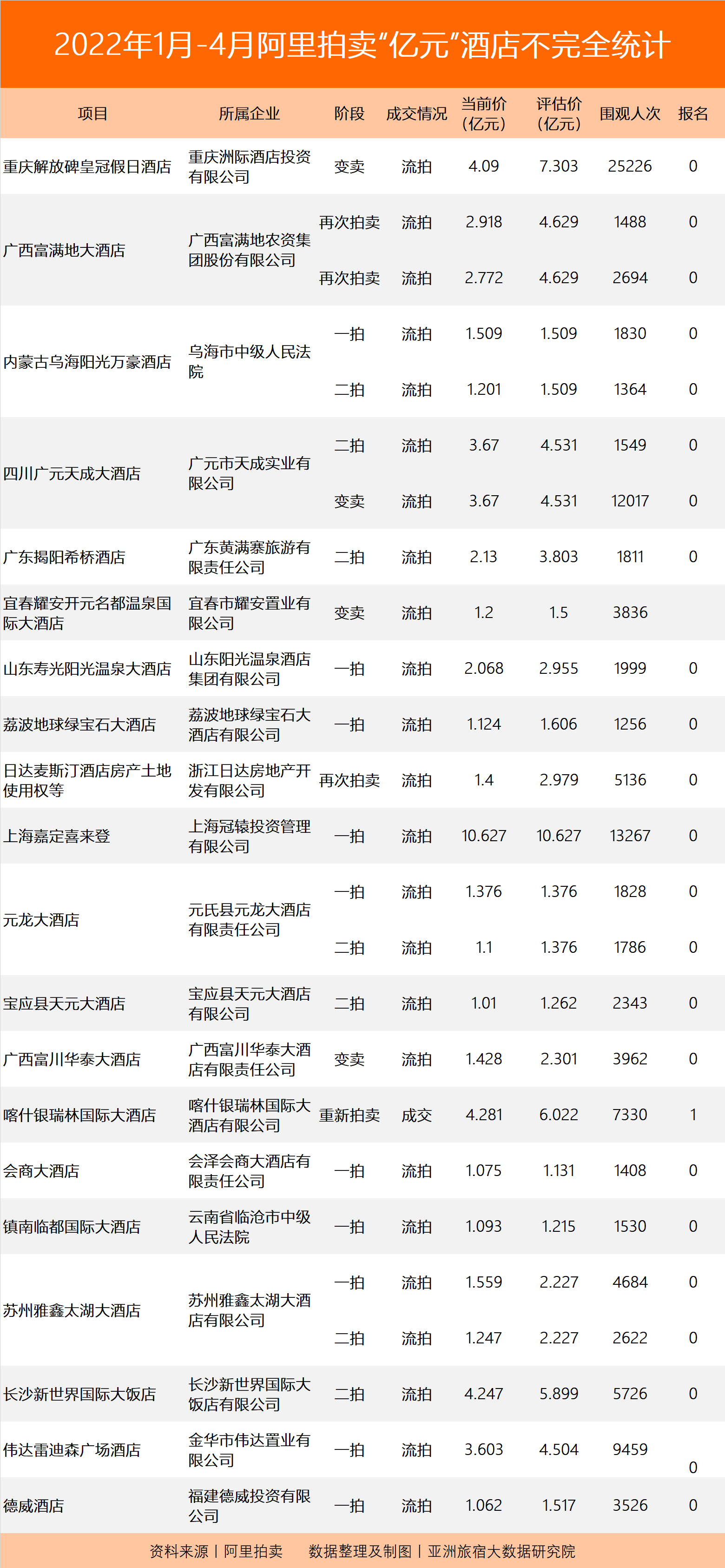 据亚洲旅宿大数据研究院不完全统计,2022年以来在阿里拍卖平台上出让价格达到亿元级别以上的共有20家酒店,涉及16个省市。一些拥有国资背景的酒店,和挂牌国际品牌的酒店,也几次流拍。亿元级别的酒店,真的这么难卖吗?
