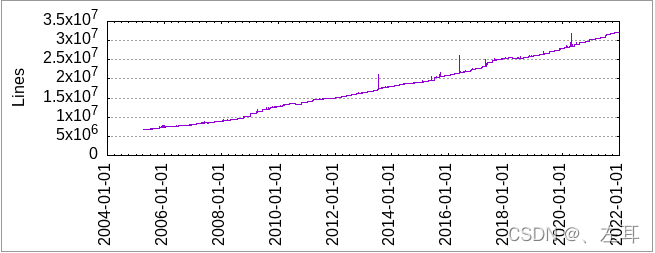 截止至2021年12月31日,在Linux内核源码树上运行GitStats时,可以看到约有24.3万个作者进行了1,060,172次提交。该源码树目前由3,220万行的代码组成,涉及74,300个文件。