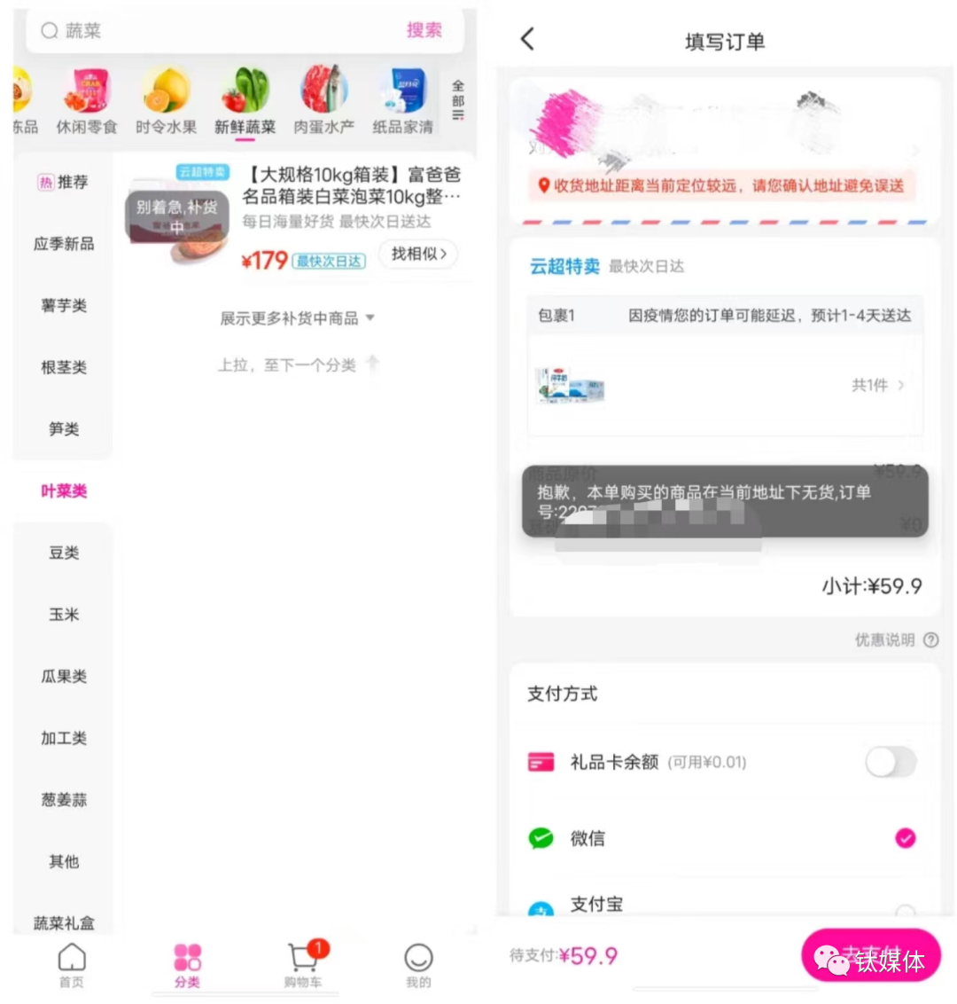 当日晚9点左右,钛媒体App尝试在每日优鲜下单发现,商品列表中以没有平价蔬菜的身影,取而代之的是大分量蔬菜或加工类食品,虽然大部分仍显示正常且可加购,但到结算页面却显示“因疫情您的订单可能延迟,预计1-4天送达”,而当付款时又显示“抱歉,本单购买的商品在当前地址下无货”。即使尝试更换多个地址,仍旧无法完成购买。