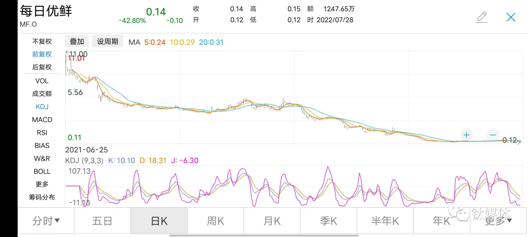 受系列消息影响,当日美股盘前,低于1美元的每日优鲜股票又暴跌了40%,截至收盘只剩下0.14美元,与发行价相比累计跌近99%。