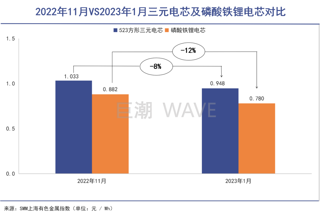 组成的电芯成本,与2022年11月相比,三元电芯成本已从1.033元/Wh下滑到0.948元/Wh,下跌8%;磷酸铁锂电芯成本自0.882元/Wh下跌至0.78元/Wh,下滑幅度达到了12%。