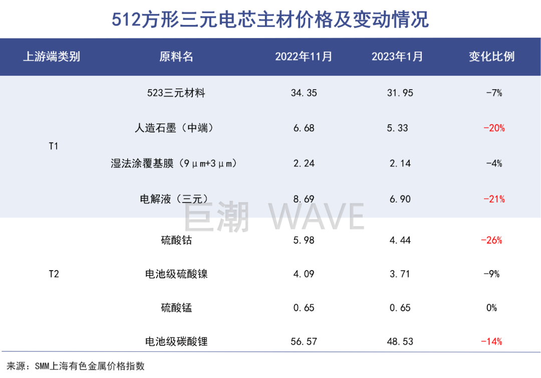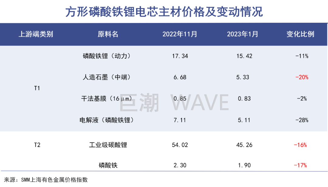 锂矿价格崩塌,势必对电芯材料产生冲击。2023年1月,无论三元锂材料还是磷酸铁锂型,正极材料、负极材料乃至电解液的价格,均较去年11月出现下滑,磷酸铁锂使用的电解液降幅高达28%。