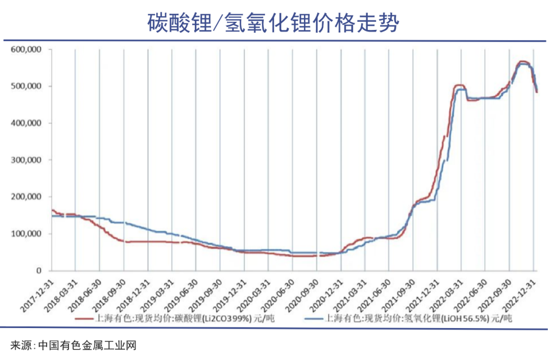 去年累计涨幅超过80%的锂价,2023年开年以来全线下跌。2月17日,电池级碳酸锂跌5500元/吨,均价44万元/吨,期货端已经降到40万元/吨以下。而在去年,碳酸锂价格最高逼近60万元/吨。