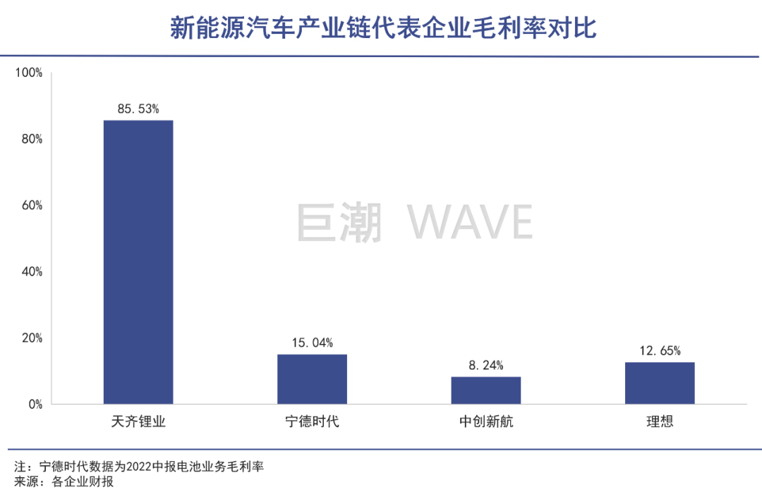 产业链越往下游盈利越差,锂矿龙头的毛利率能达到惊人的85%,电池生产商宁德时代动力电池业务毛利率仅15%,中创新航仅有8%,整车厂的盈利就更加孱弱,除了特斯拉和一体化的比亚迪之外,蔚小理、零跑等新势力都还在巨亏之中。