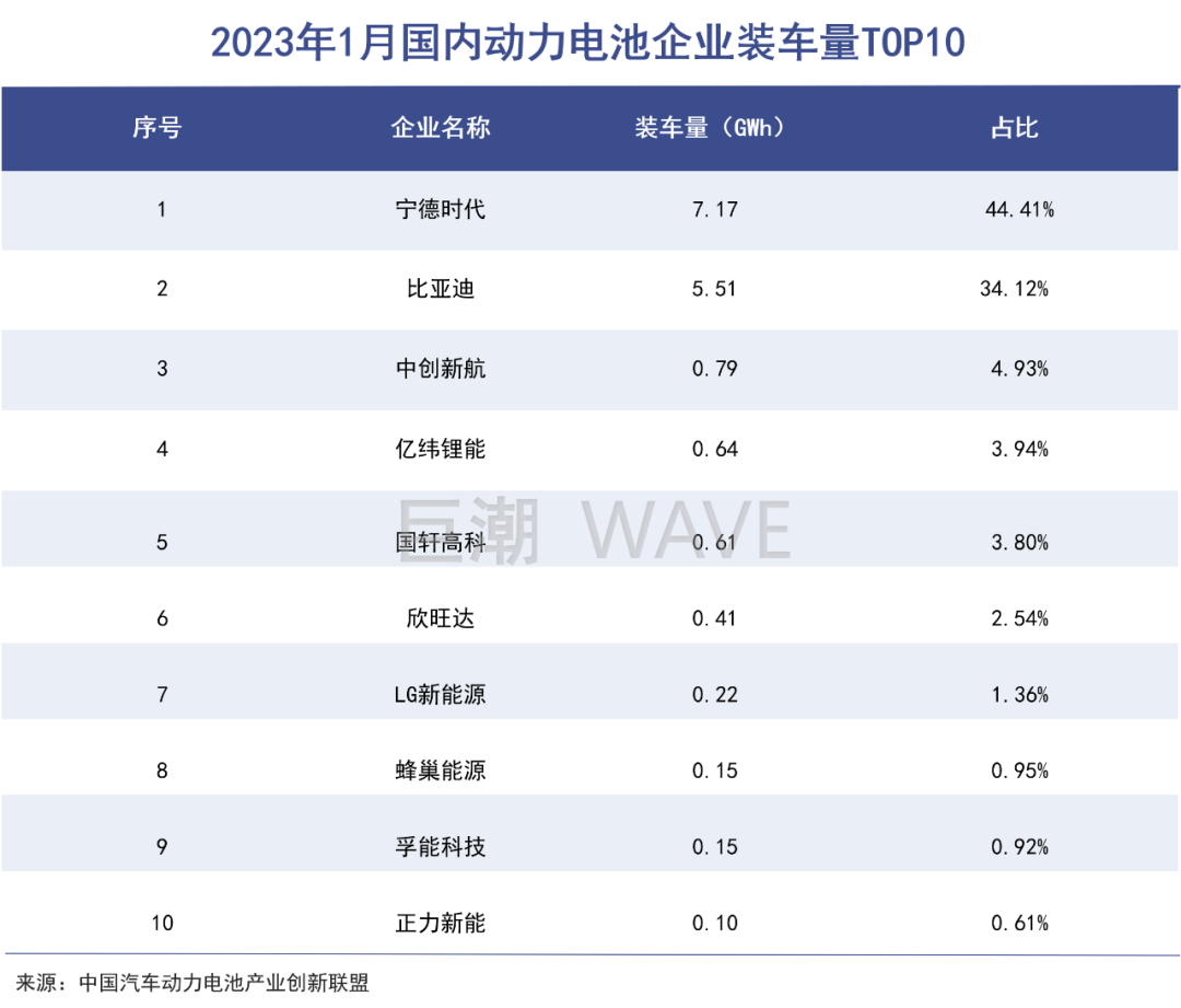 今年1月份,宁德时代装车量7.17GWh,市场占比44.41%,同比下降5.8个百分点,环比也下滑了3.8个百分点。
