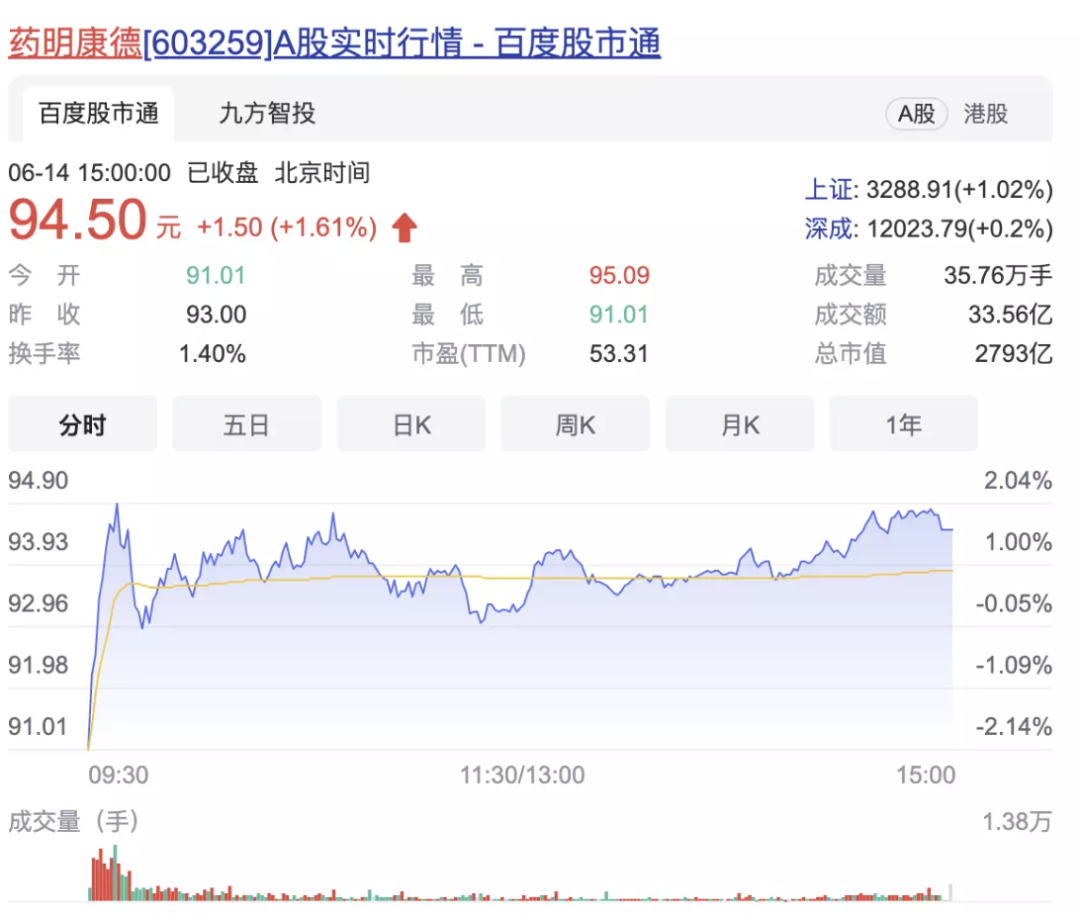 如果说留下来的股东,都是看好药明康德的业绩和未来。公司控制人的离场,让广大股东开始紧张。6月13日药明康德A股股价跌幅9.51%,跌至93.05元;港股股价跌幅高达10.29%报94.55港元。