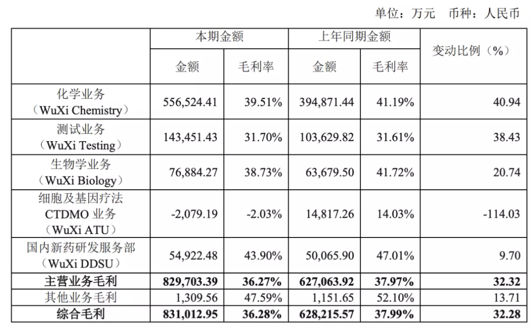 暴涨的客户,并未带来更多的毛利率。2021年财报显示,**药明康德的毛利率仅36.28%**,并且相比较2020年的37.99%下滑了1.71%。其中细胞及基因疗法业务甚至出现了2079.19的亏损。