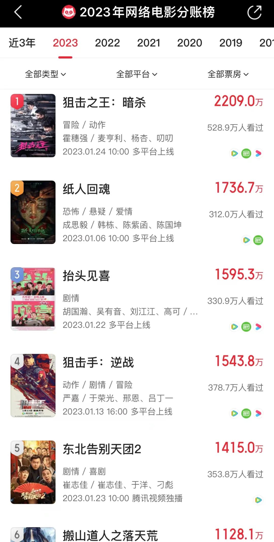 截至目前,2023年已有《狙击之王:暗杀》《纸人回魂》《抬头见喜》《狙击手:逆战》《东北告别天团2》《搬山道人之落天荒》六部影片分账票房破千万,其中《狙击之王:暗杀》是唯一一部分账破2000万的。这一成绩相较去年稍显逊色,2022年同期,《龙云镇怪谈》《我不是酒神》等八部影片进入了千万分账行列。