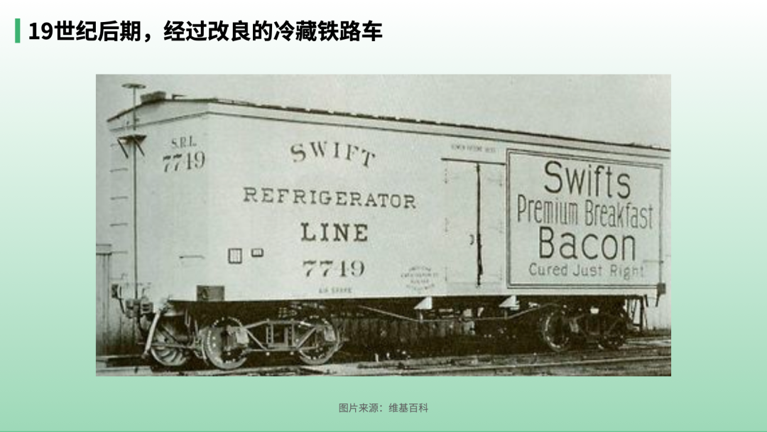 不要小看这个方法,这极大程度延长了食品的储存和运输周期,减弱了易损食品的季节性价格波动,丰富了美国消费者餐桌上的食品选择。《美国增长的起落》一书对这项技术评价颇高,认为在19世纪90年代,人体营养的改善有一半功劳来自“制冷”。