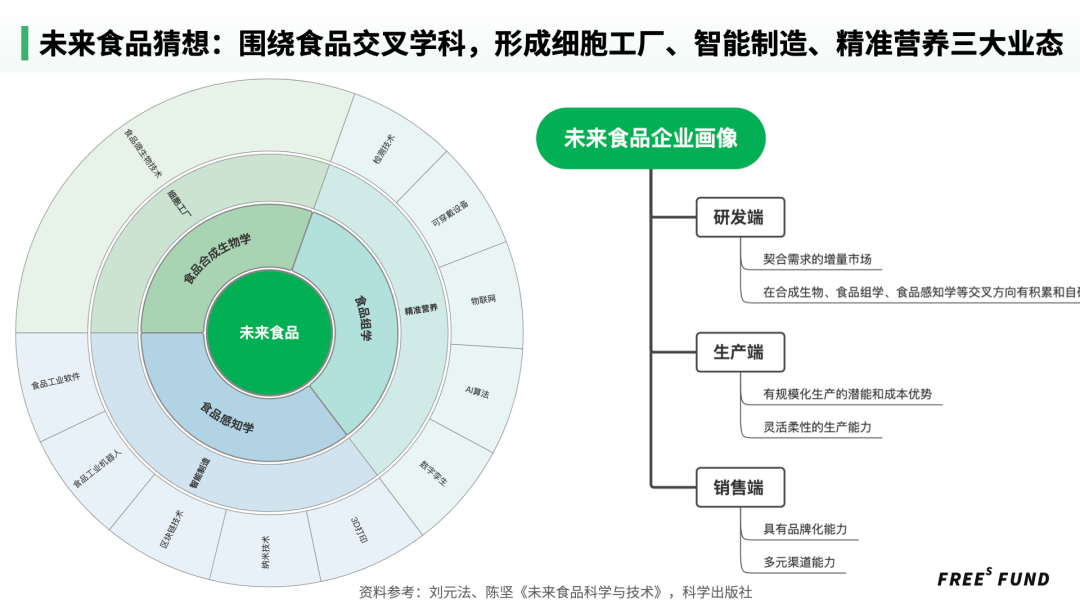 我们相信,未来食品行业会围绕着食品的交叉学科,最终形成包含细胞工厂、智能制造和精准营养在内的多种业态,由此还将衍生出一系列新的技术在食品领域的应用,比如3D打印、数字孪生、工业机器人及微生物技术等。