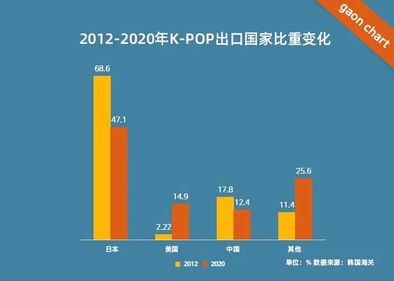 其次,据IFPI最新发布的《全球音乐报告》显示,美国录制音乐市场仍然牢牢占据第一的位置。对于众多韩国组合来说,美国仍然是一块亟待开发的音乐市场。据韩国权威榜单Gaon网站的数据显示,2012-2020年K-POP对美国的出口比例从2.22%上升至14.9%。