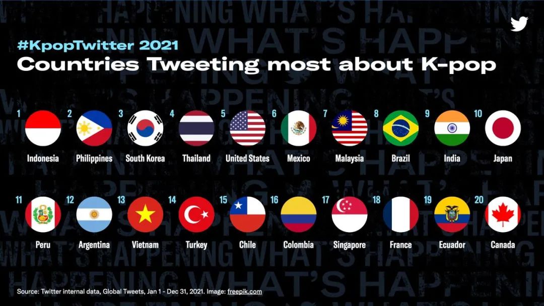 如今,K-POP的亚洲市场基本成熟。同样以话题#KpopTwitter的推文数量为例,印度尼西亚已连续两年在推文数量榜单中名列前茅,菲律宾、泰国、马来西亚、印度也进入前十名。