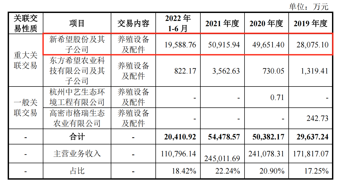 2019-2022年上半年,大牧人股份对新希望股份及其子公司出售商品和提供劳务的关联交易金额剧增,分别为2.81亿元、4.97亿元、5.09亿元和1.96亿元,占当期关联交易的比例分别为94.73%、98.55%、93.46%和95.97%,占当期营业收入的比例分别为16.34%、20.59%、20.78%和17.68%,主要销售的产品为养猪设备。