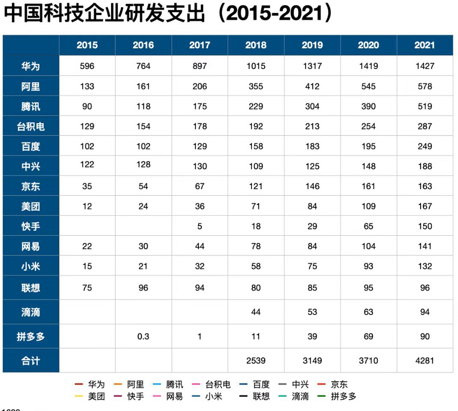 雷军在18年5月的公开信中明确表示:“小米不单是硬件公司,也是互联网公司”。那么对于互联网公司,研发投入就是它的“生命源泉”。我们结合数据来扒一下小米的研发投入。2015-2021在财经网统计的14家互联网公司中,小米的研发投入排名实际偏后。