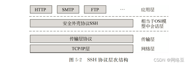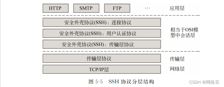 SSH协议是一个分层协议,如图5-5所示。由三层组成,即传输层协议,用户认证协议,连接协议