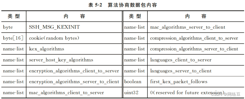 版本协商成功后,双方就开始采用二进制数据包进行通信。由服务器向客户端发送第一个包.内容为自己的RSA主机密钥(Host Key)的公钥部分、RSA服务密钥(ServerKey)的公钥部分、支持的加密方法、支持的认证方法、次协议版本标志以及一个64位的随机数(Cookie)。这个包没有加密,以明文方式发送。
