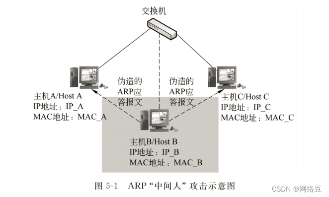- 以ARP“中间人”攻击为例,按照ARP协议的设计,一个主机收到的ARP应答即使并非自身请求得到的,也会将其IP地址和MAC地址的对应关系添加到自身的ARP映射表中。