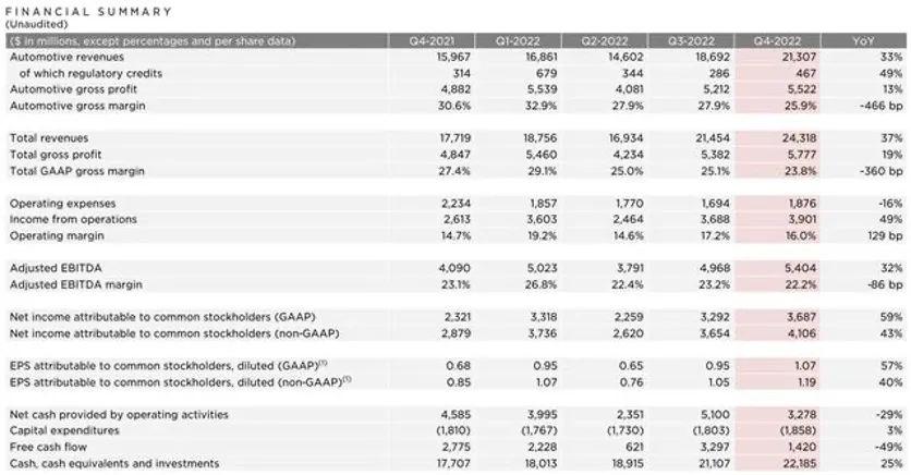 由于出色的成本控制,毛利率方面,2022年最高峰时刻,特斯拉单车毛利率一度高达32.9%。到1月25日特斯拉公布的2022年第四季度财报,其中单车毛利率依然高达25.9%,远高于比亚迪2022年第三季度15.89%的毛利。