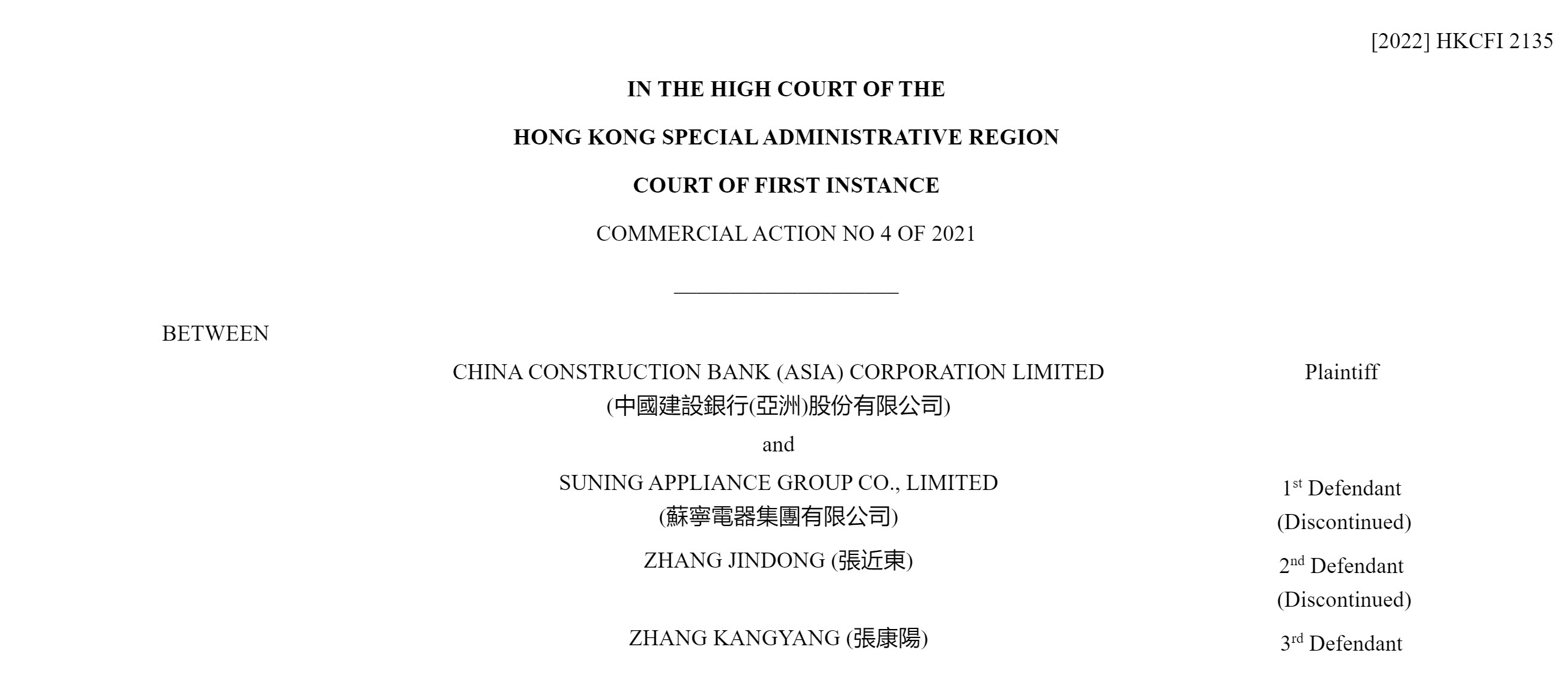 近日,香港高等法院发布了一起重大金融交易案件的判决,案件的主角正是苏宁集团创始人张近东之子张康阳。中国建设银行(亚洲)有限公司状告张康阳逾期未偿还贷款,追偿2.25亿美元的借款,约合人名币17.19亿元。