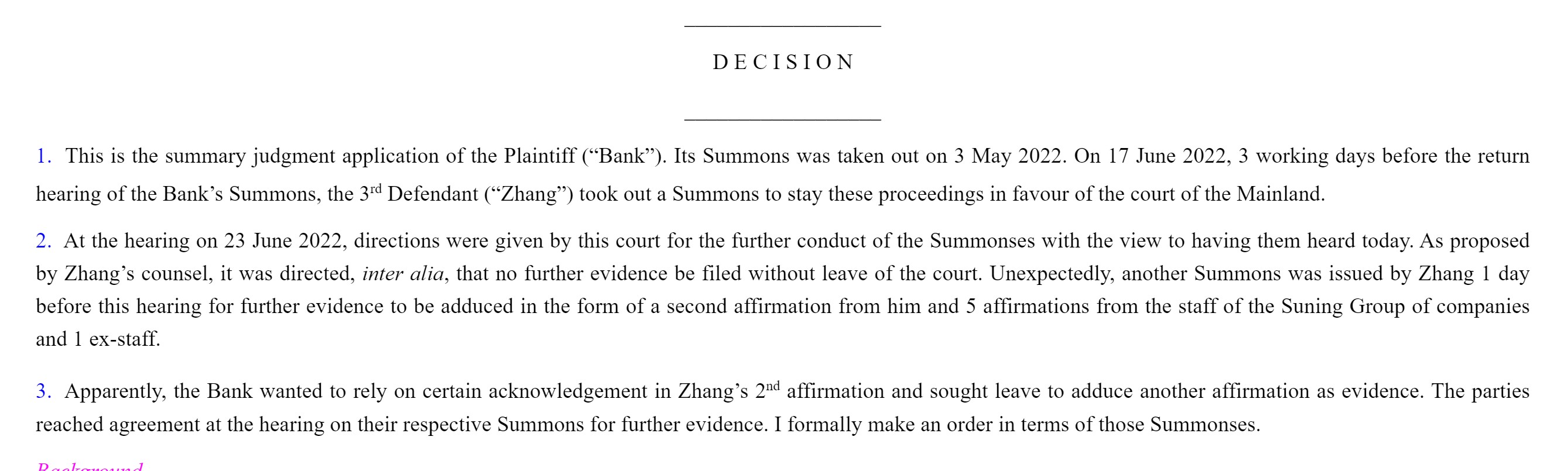 张康阳还曾申请搁置诉讼,认为两名至关重要的证人身处内地,加上苏宁的实体业务主要在内地,诉讼应于内地法院进行。不过,法官表示,该项融资是与香港的银行商议,亦涉及内地以外的贷款人,驳回申请。