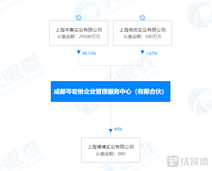 钛媒体APP通过天眼查发现,成都岑宏佾由岑集实业、佾宏实业分别持股98.33%、1.67%,而其出资额与国家企业信用信息公示系统披露的一致。