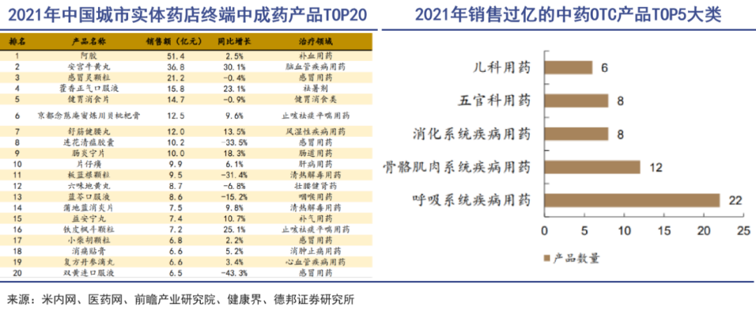 中药OTC在零售端也确实有不少大卖的单品,比如2021年,健胃消食片的销售额达到14.7亿元,藿香正气口服液的销售额达到15.8亿元,阿胶的销售额则达到51.4亿元,是中成药里的销冠。