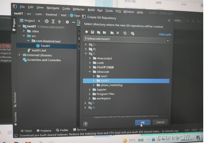 7)输入我们复制的仓库地址点击OK(若是第一次则会出现填写gitee账号和密码的弹出框,填写正确地账号和密码即可)