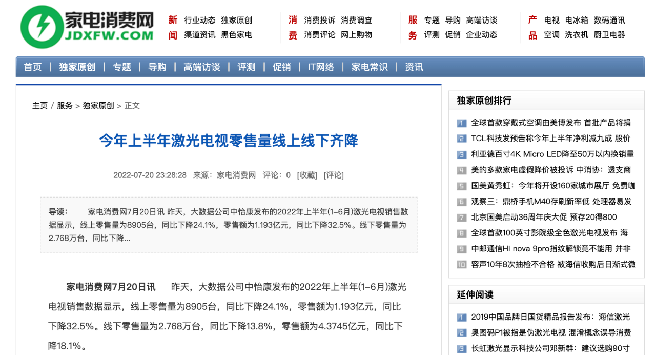 最惨的是激光电视这一类目。据家电消费网报道,中怡康数据显示2022年上半年(1-6月)激光电视线上零售量为8905台,同比下降24.1%,零售额为1.193亿元,同比下降32.5%。线下零售量为2.768万台,同比下降13.8%,零售额为4.3745亿元,同比下降18.1%。