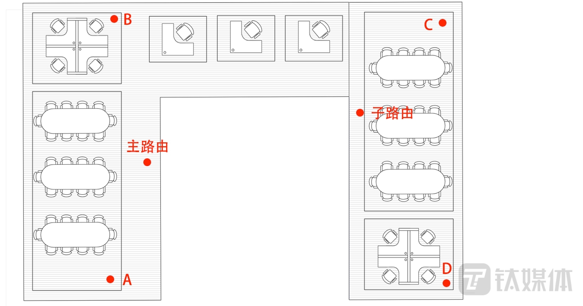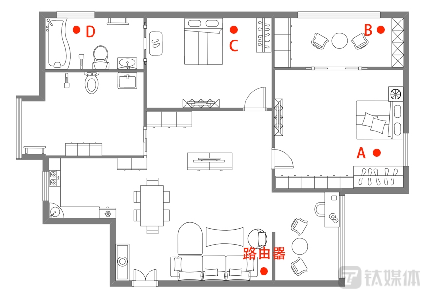 首先笔者对单台产品的覆盖能力进行了测试,先看一下测试的环境,笔者家大概在90平左右,入户光猫在客厅外墙位置,测试点共分为A、B、C、D四个位置。