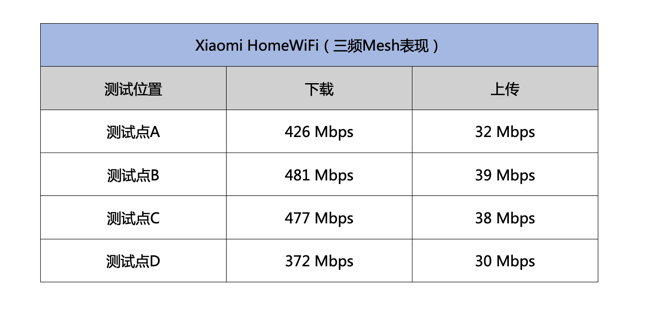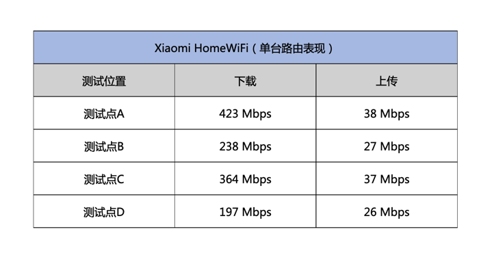 从上面的测试可以看到,在相对接近与较少实墙遮挡的测试点A和测试点C的成绩相对更加理想,Xiaomi HomeWiFi的2.5G网口,支持最高2500兆宽带接入,还支持双LAN聚合,成倍提升内网传输速率,触达更高网络上限,更满足了未来宽带升级需求。
