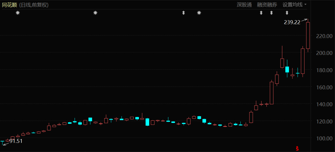 坐上了ChatGPT的东风,同花顺犹如干柴遇烈火,股价像火箭般蹿升。2023年以来,同花顺股价大涨1.4倍。4月3日,更是一度触及239.22元/股(前复权)的历史新高,总市值突破1260亿元关口。