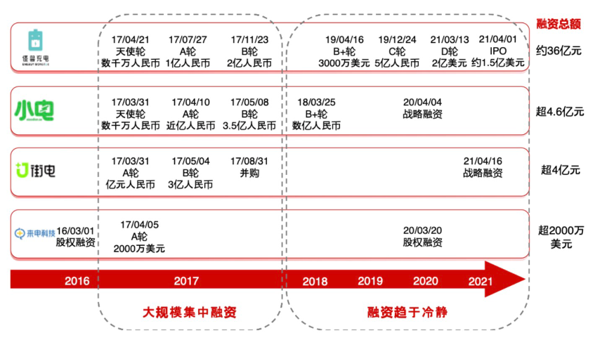 从2015年左右共享充电宝面世,次年迎来投融资热潮,各路玩家争相入局,再到2017年行业出清,泡泡充电、河马充电、小宝充电、放电科技等玩家先后停运,怪兽后来居上,行业开始分化梯队,留下头部的“三电一兽”的格局,数据显示,这一年共发生20笔共享充电宝赛道的融资,头部企业均获得亿级人民币的输血。