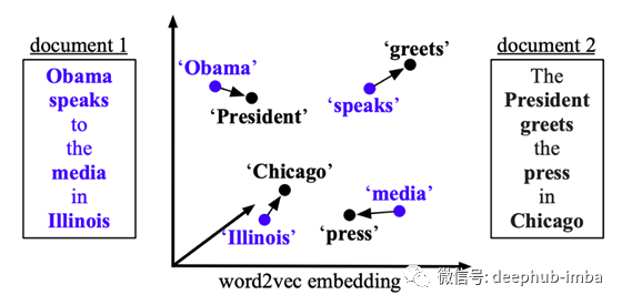 文档分类和文档检索已显示出广泛的应用。文档分类的重要部分是正确生成文档表示。马特·库斯纳(Matt J. Kusner)等人在2015年提出了Word Mover’s Distance(WMD)[1],其中将词嵌入技术用于计算两个文档之间的距离。使用给定的预训练单词嵌入,可以通过计算“一个文档的嵌入单词需要“移动”以到达另一文档的嵌入单词所需的最小距离”来用语义含义来度量文档之间的差异。