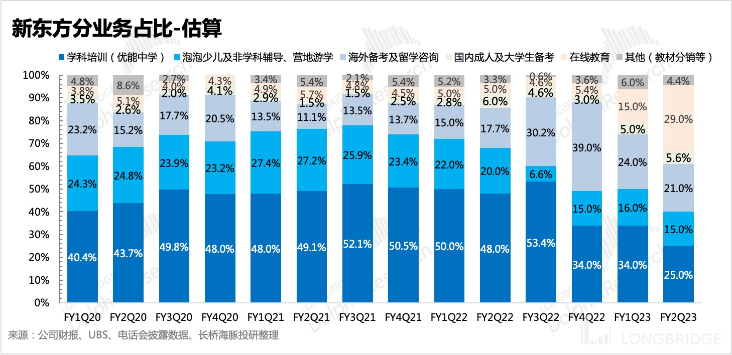 另外,随着政策实施后,新东方推进的新业务逐步贡献越来越高的收入,包含 K12 非学科培训、智慧学习产品、游学三个细分项组成的【新业务】口径,也会不定期披露营收占比。