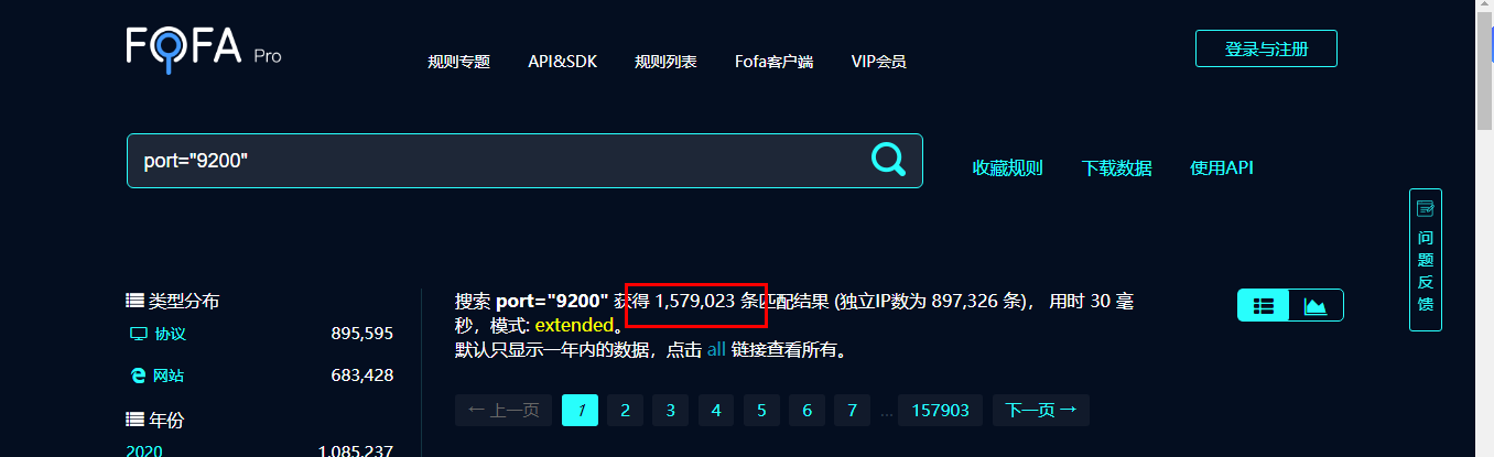 使用fofa搜索开放了9200端口的IP,获得1579023条数据。