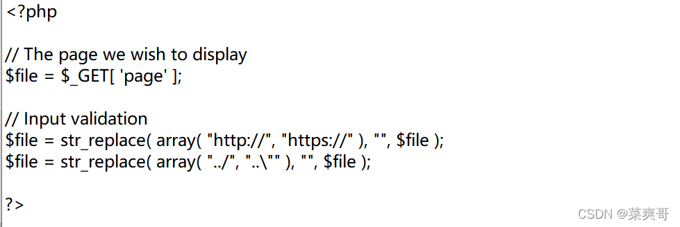 看下核心源码:这里使用白名单。page参数必须为:include.php 、 file1.php 、 file2.php 、 file3.php 。杜绝了文件包含漏洞。
