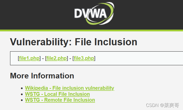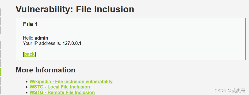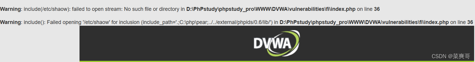 报错。故服务器系统不是Linux。且文件的绝对路径为D:\PhPstudy\phpstudy_pro\WWW\DVWA\vulnerabilities\fi\index.php