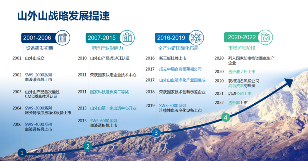 山外山成立于2001年,主要从事血液净化设备与耗材的研发、生产和销售,并提供连锁血液透析医疗服务。产品广泛应用于治疗各类急慢性肾功能衰竭、尿毒症、多脏器衰竭和中毒等多种病症。