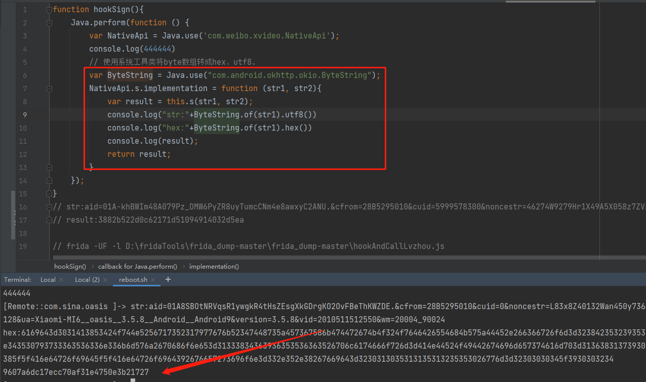 还是上面的frida脚本,先hook下,看看入参和返回: