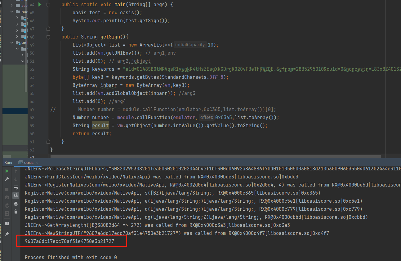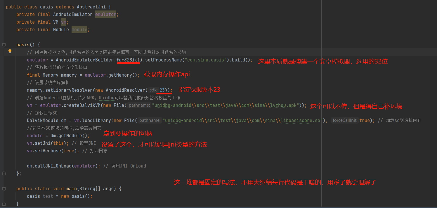 DalvikModule dm = vm.loadLibrary(new File("unidbg-android\\src\\test\\java\\com\\sina\\liboasiscore.so"), true); // 加载so到虚拟内存