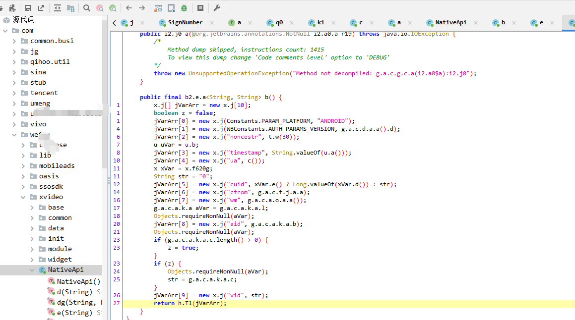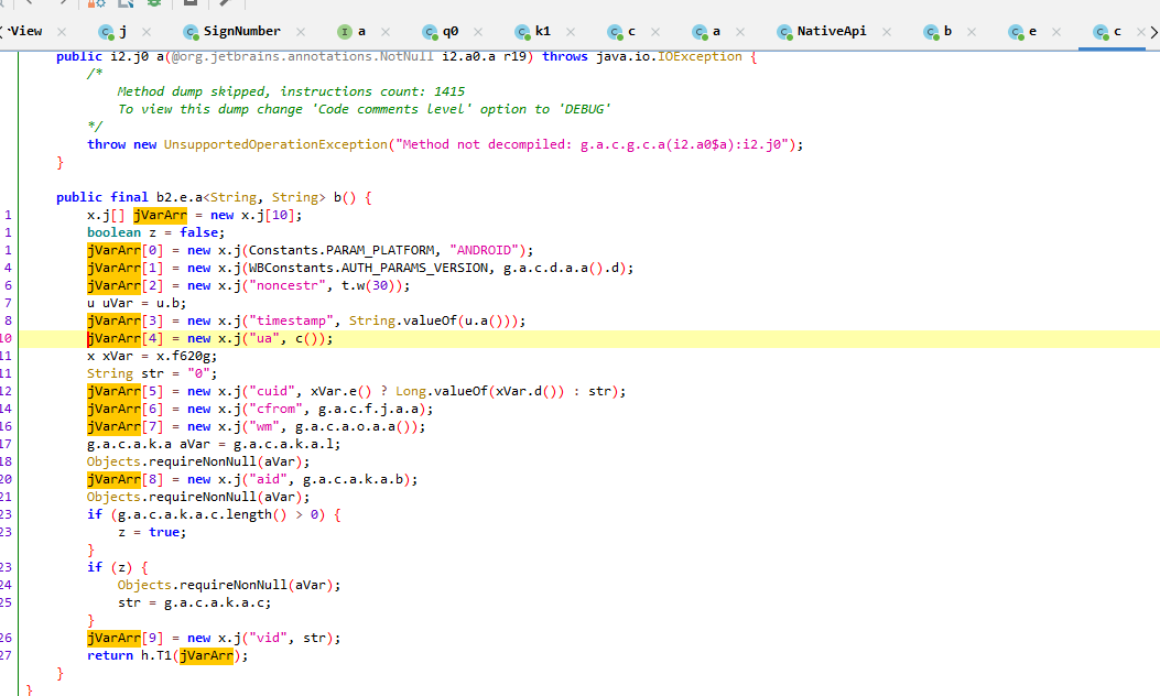 但是我们要找【sign】,所以还得再看看,jadx查看发现,这个方法反编译效果不太好,问题不大,记住这个dex名,然后用GDA 打开这个dex,这就挺好,基本都反编译出来了