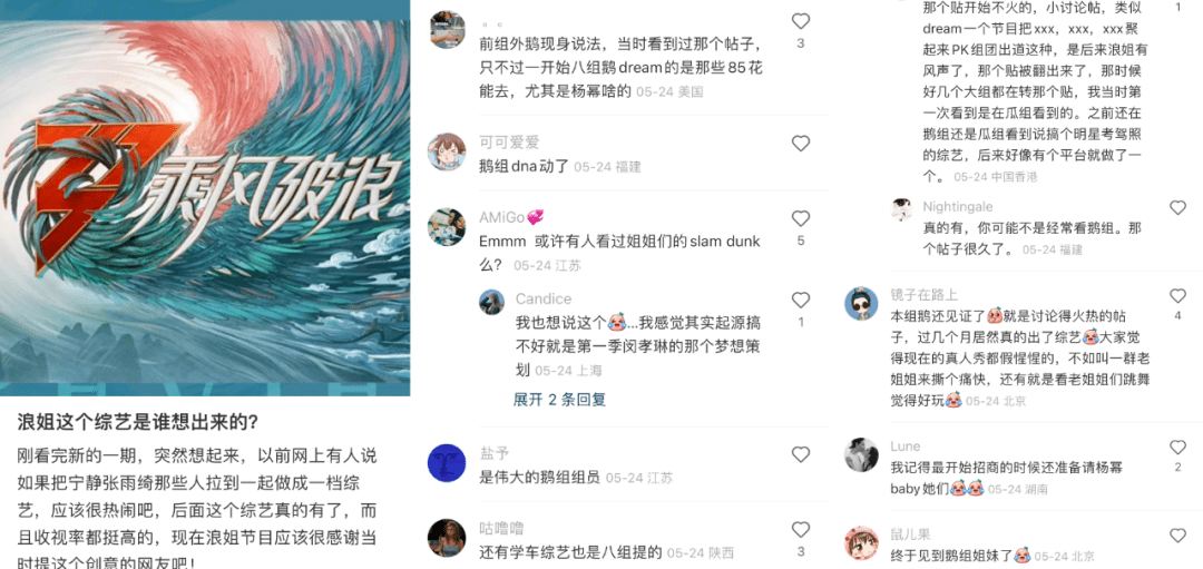 坊间最出名的一个案例当属《乘风破浪的姐姐》。喜看八卦的老娱人都知道,这综艺最早的概念源起于一个已经凉凉的娱粉集散地——豆瓣鹅组(很多年前的“八组”)。在当年那条闻名组内外的热帖里,发帖人最初想法,是希望看到一档聚起一群女明星组团出道的综艺,由于当时拟邀人选多为杨幂、angleababy等85花,激发了鹅组姐妹想看女明星扯头花的强烈愿望。