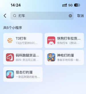 在搜索“打车”这个关键词后,抖音小程序给出的搜索结果中只有“T3打车”和“快狗打车”,后者专注货运市场。