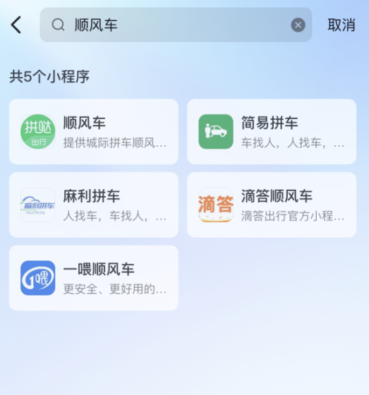 另外,我还在抖音的小程序中搜索了“网约车”、“顺风车”、“拼车”等几个和网约汽车服务相关的关键词,除了“顺风车”这个关键词以外,其他几个关键词搜索出来的小程序基本都是一些与网约出行无关的小程序。
