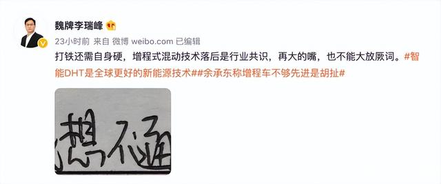 这引发了魏牌CEO李瑞峰在微博上的反对:增程式混动技术落后是行业共识,再大的嘴,也不能大放厥词。之后李瑞峰再次发博重申自己的观点“增程式就是落后的,隔行如隔山,别把随性当个性。”