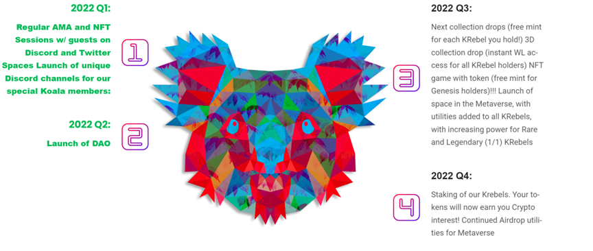 Krebels 是 1,009 个独特的以考拉为灵感的NFT 的集合,旨在提高人们对保护考拉物种的认识,同时储备救助资金。KRebels 已承诺从每个 NFT 的销售中抽取一定比例来支持慈善机构,帮助拯救考拉免于灭绝及保护其栖息地。