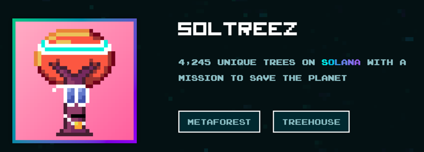 SolTreez则是 4,245 个树木NFT的集合,其目标是使用 NFT 来支持植树。每笔SoltreeZ的交易,都会通过他们的慈善伙伴One Tree Planted种植10棵真树。他们的目标是通过出售 NFT 种植 100,000 棵树。