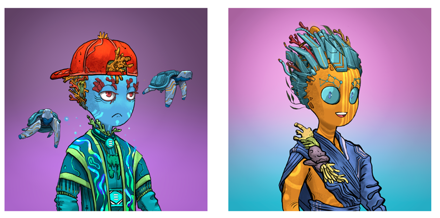 Crypto Coral Tribe则是通过与Solarpunk代表艺术家** J. Quiroz** 合作,Crypto Coral Tribe 打造了 9000个独一无二的NFT珊瑚头像,每个头像都描绘了一种融入了本土艺术和赛博朋克风格的珊瑚“生物”。旨在利用艺术和区块链技术改革可持续投资,并将 50% 的收入用于海洋和野生动物保护计划。该项目的第一个承诺是在 3 大洲种植 3000 颗珊瑚。
